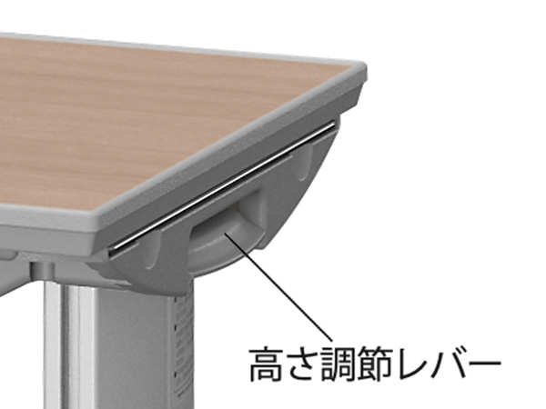 安定しやすい両脚タイプのテーブルです。レバー操作だけで簡単に高さ調節が可能です。