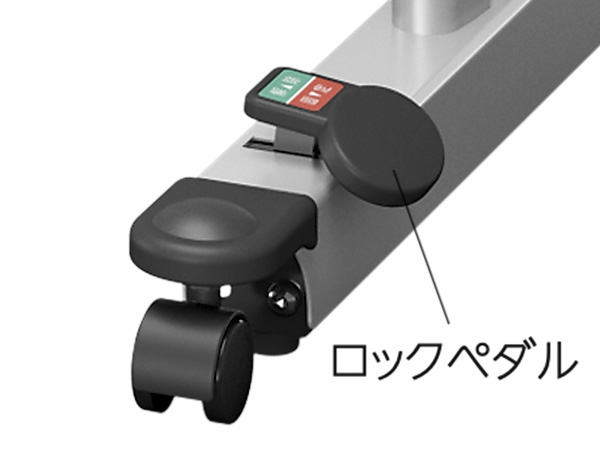 脚部には移動用のキャスターを設けています。安定した状態でテーブルを使用できるように、キャスターを浮かせてテーブルの移動を抑えるロック機構※を採用しています。ロック機構の操作は、大型のロックペダルでおこなえます。