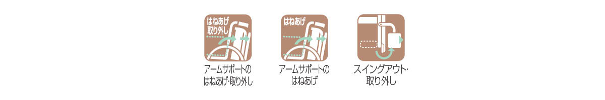 アームサポートのはねあげ、取り外しができます。座位での移乗や、イージーグライドを使った移乗に必要です。