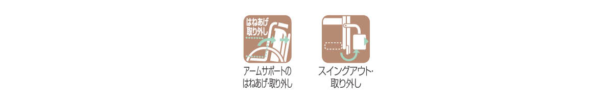 アームサポートのはねあげ、取り外しができます。座位での移乗や、イージーグライドを使った移乗に必要です。