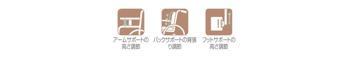 アームサポートの高さ調節ができます。姿勢を安定させるため両肘の高さを適切な位置に合わせます。シートにクッションを併用する場合など座面の高さに合わせて調節します。