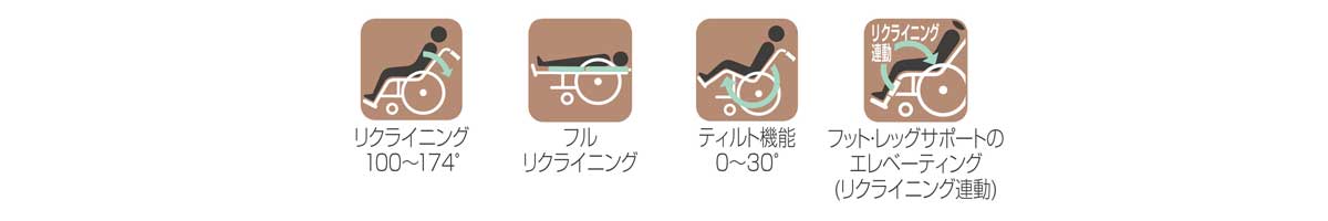 座面と背もたれの角度を保ったまま全体を30°まで傾斜できるので、従来の車いすでは座位を保持することが困難だった方に対応できる場合があります。また、ティルト機能を使うと姿勢を保ったまま圧力のかかる部位が変えることも可能です。