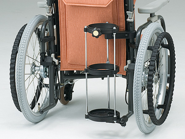 ※転倒防止バーの付いていない車椅子に酸素ボンベホルダーを取り付ける場合は、必ず転倒防止バー(別売)を取り付けてご使用ください。