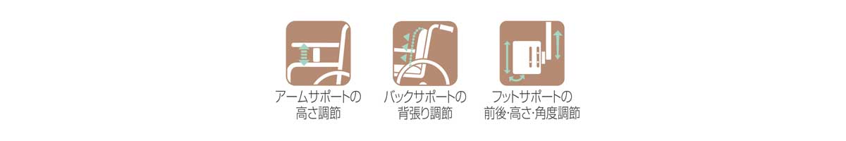 状況に合わせてフットサポートの前後・高さ・角度調節ができます。靴の厚みやクッション使用時の変化にも対応できます。