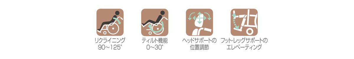 座面と背もたれの角度を保ったまま全体を30°まで傾斜できるので、従来の車いすでは座位を保持することが困難だった方に対応できる場合があります。また、ティルト機能を使うと姿勢を保ったまま圧力のかかる部位が変えることも可能です。