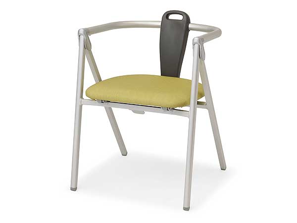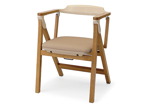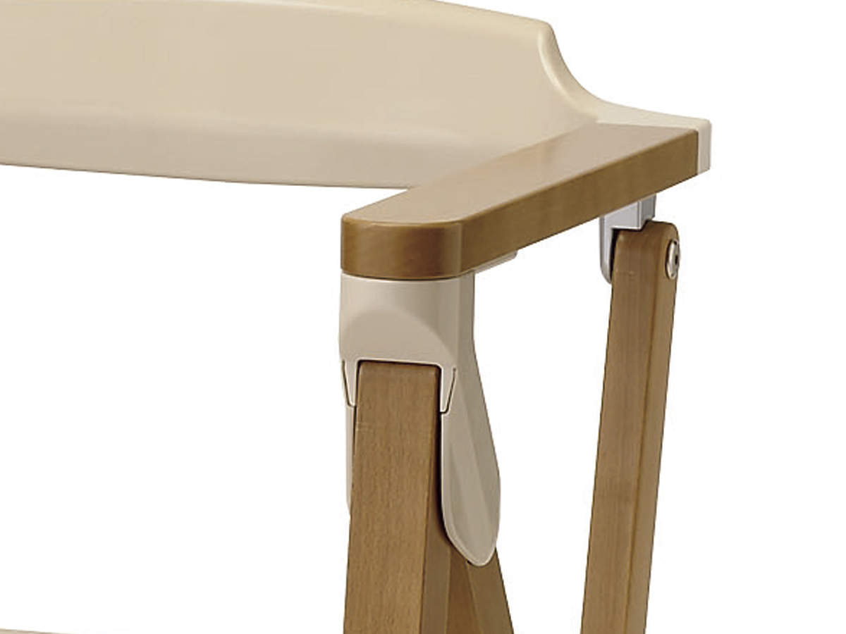 座面は安定性に優れており、座面に不意に手を突いても折りたたまれてしまうことがありません。肘掛を設けているので、座位姿勢の安定と立ちあがりやすさにも配慮しています。